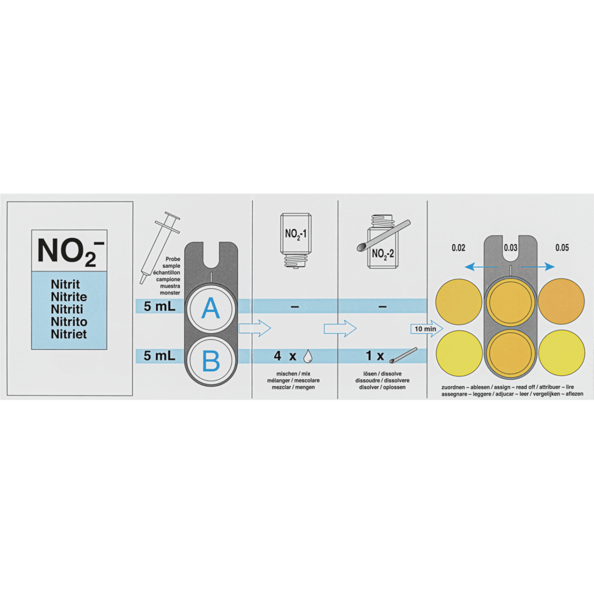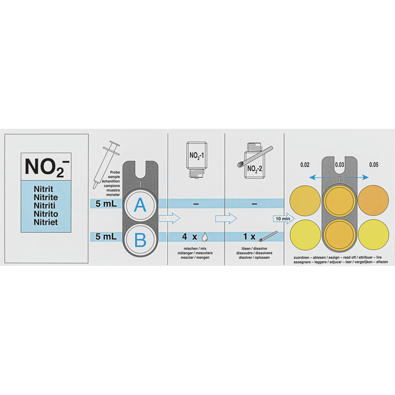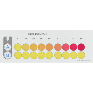 Nitrite – ۰ • ۰٫۰۲ • ۰٫۰۳ • ۰٫۰۵ • ۰٫۰۷ • ۰٫۱ • ۰٫۲ • ۰٫۳ • ۰٫۵ mg/L NO₂⁻ درجه بندی    رنج